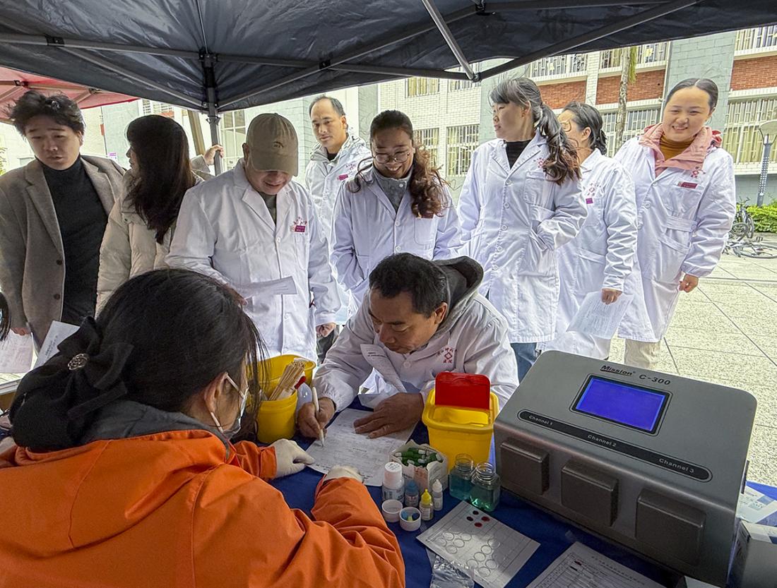 活动当天气温骤降、寒风凛冽,却挡不住大家的献血热情。农工党市委会工作人员、校医院医护人员与桂林市中心血站工作人员密切配合,有序开展信息登记、健康检查、血液采集等工作。校医院职工积极响应号召,13名医护人员主动报名参与献血。经过严格的健康筛查,最终10名职工符合献血标准,成功捐献血液共计3200毫升。这些带着温度的血液将通过血站,为急需输血的患者送去生命希望。