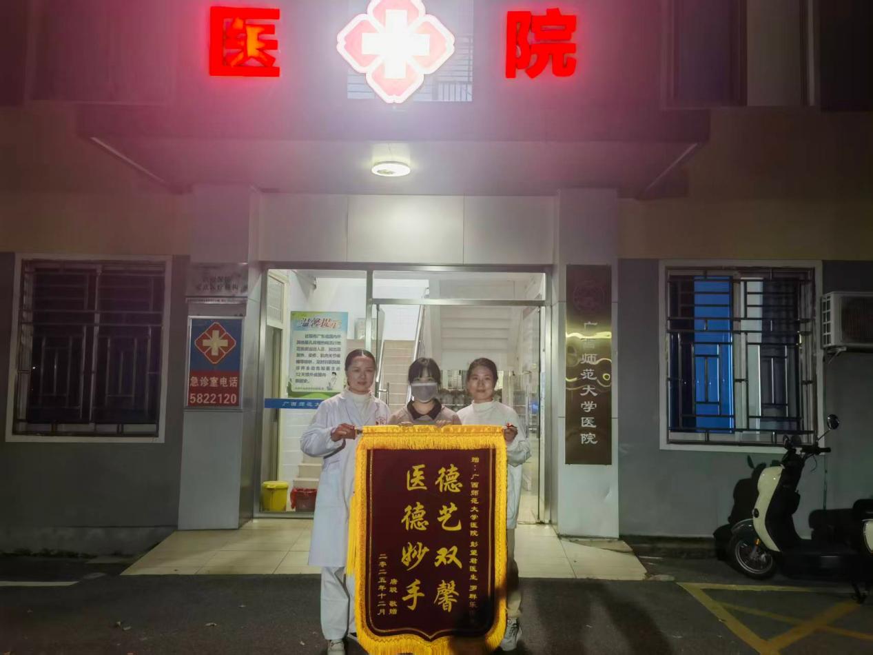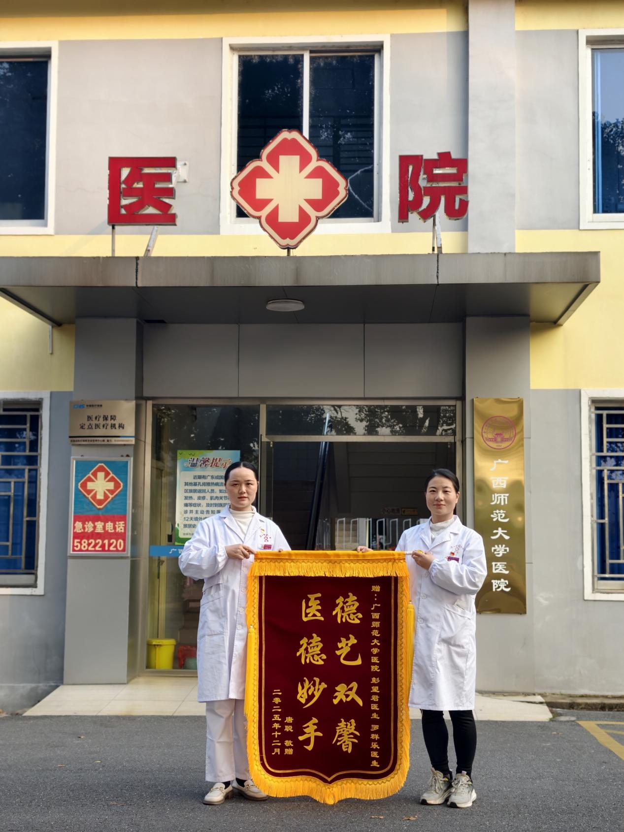 作为党员的彭望君医生,以及新晋预备党员的罗群乐护士,始终将党员的责任与担当放在首位。在征得唐同学同意后,罗群乐护士俯身凝神,手持专业工具小心翼翼地逐根挑刺;彭望君医生则在一旁配合指导、观察情况。近一个小时里,二人始终专注细致,未曾因操作繁琐有过半分懈怠。当最后一根尖刺被成功取出,唐同学的手部疼痛彻底缓解,看着医护人员额角的汗珠,她心中满是感动:“本来只是抱着试试的心态来校医院,没想到医生和护士这么有耐心,花这么久时间帮我把刺都挑干净了。”为表达这份感激,她特意定制锦旗,亲手送到两位医护人员手中。