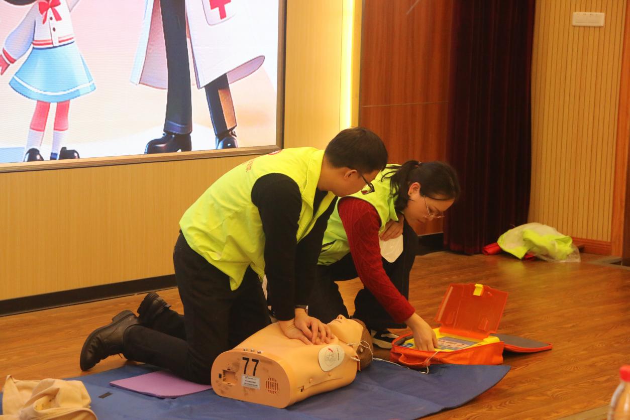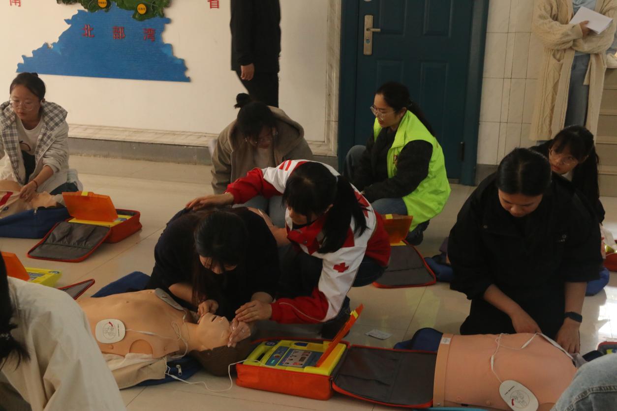 本次培训包括理论讲授与实操演练两个环节。首先,桂林市中西医结合医院的医护人员围绕心肺复苏(CPR)的操作要点和自动体外除颤器(AED)的使用方法进行了详细讲解,并进行了现场示范,帮助同学们直观掌握急救流程。