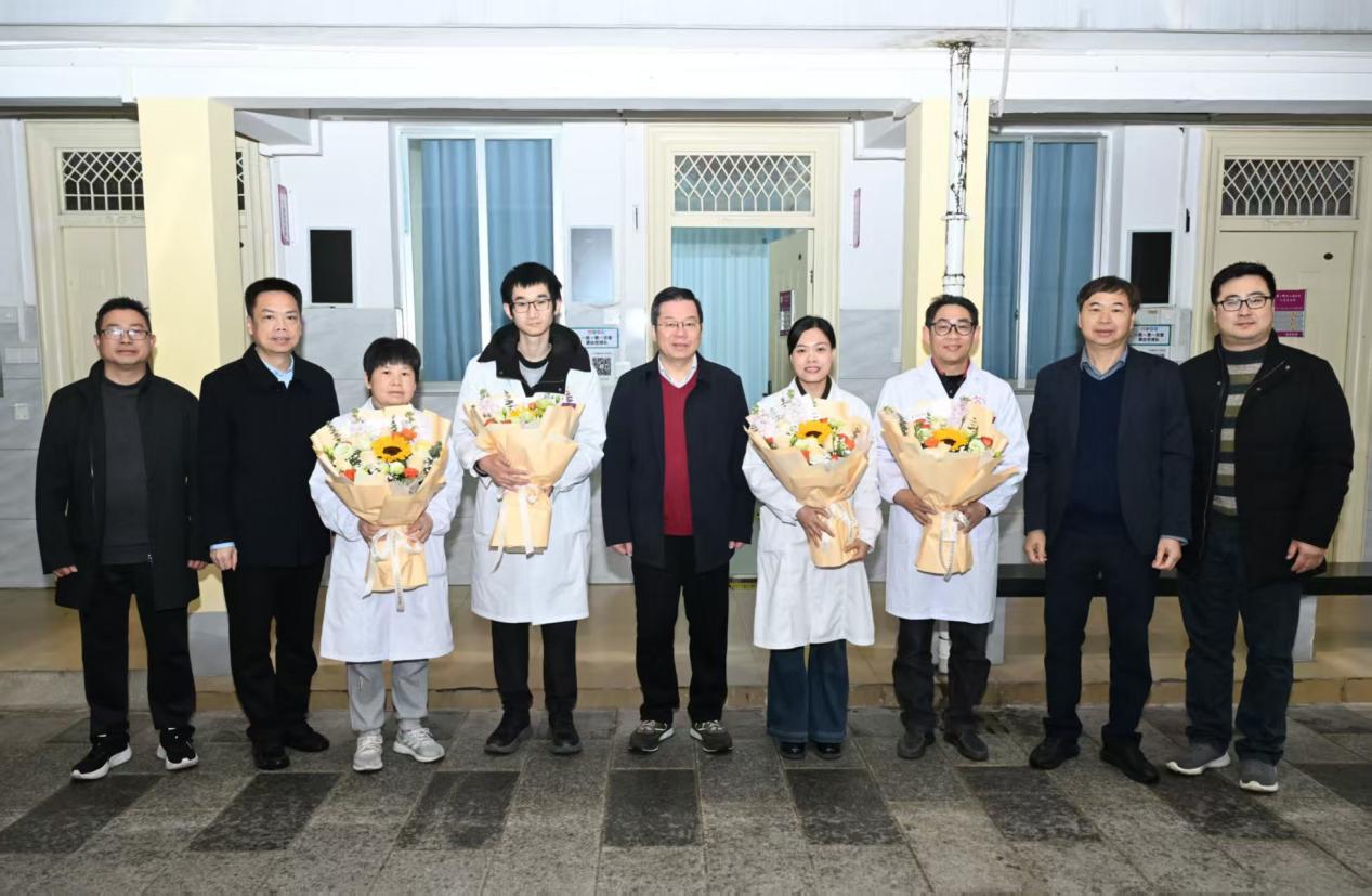 校党委书记贺祖斌、校党委副书记黄文韬、副校长林国庆与校医院值班人员合影
