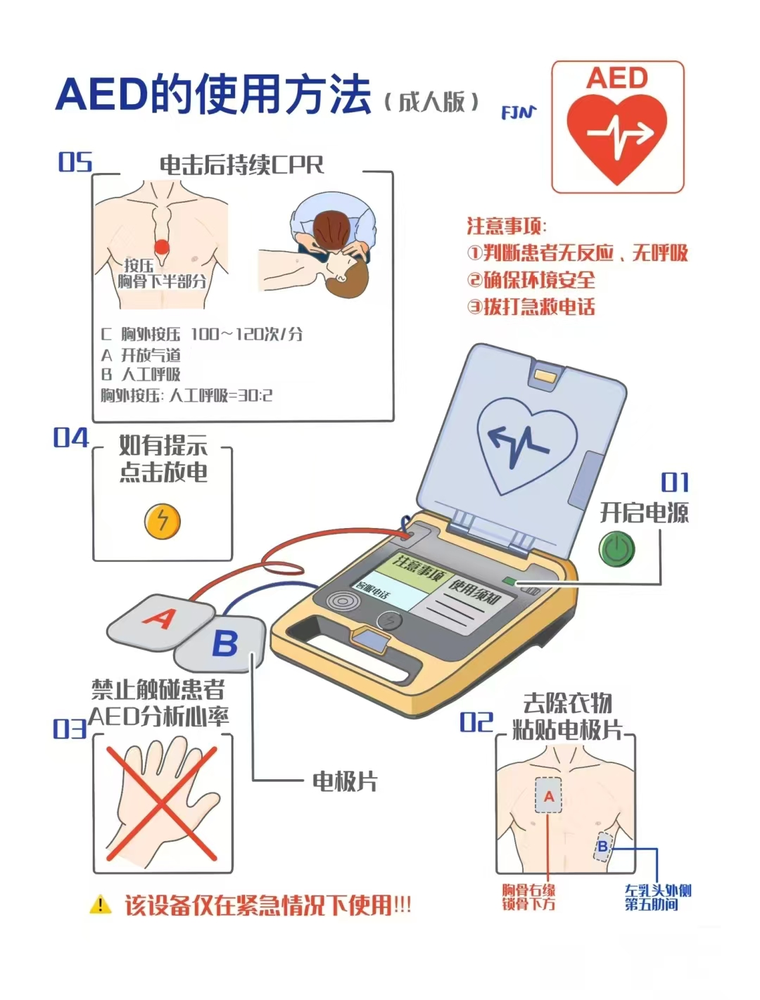 同时对患者进行心肺复苏,AED拿到后按机器语音提示操作即可。