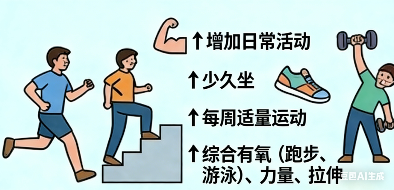 增加日常活动量,多走路、少久坐。