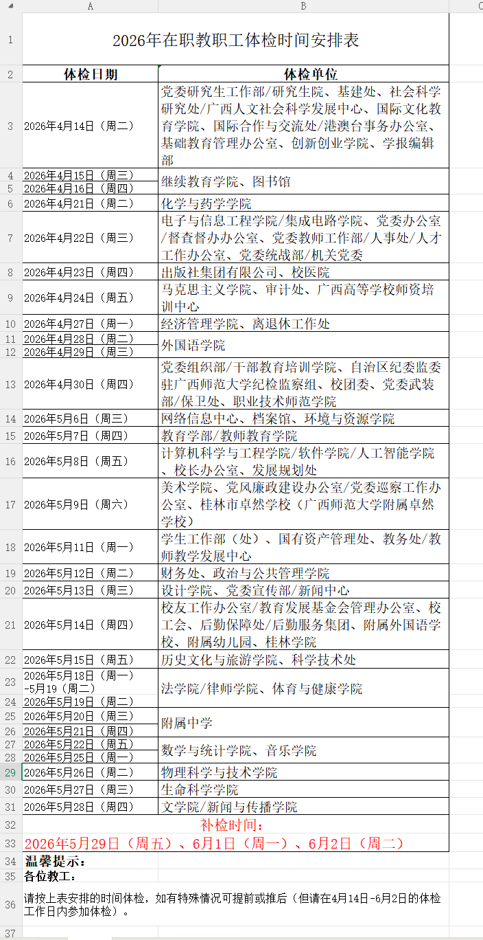请各学院(部)、各单位组织好本单位教职工按时体检,具体体检须知详见附件1。