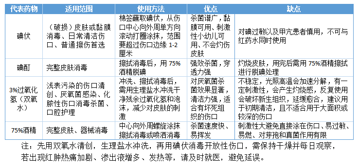 生活中难免遇到受伤情况,割伤、摔倒碰伤、宠物咬伤等,人们大多会在药箱中准备双氧水、碘伏、酒精等消毒水,但不同消毒药品的使用情况是有区别的。